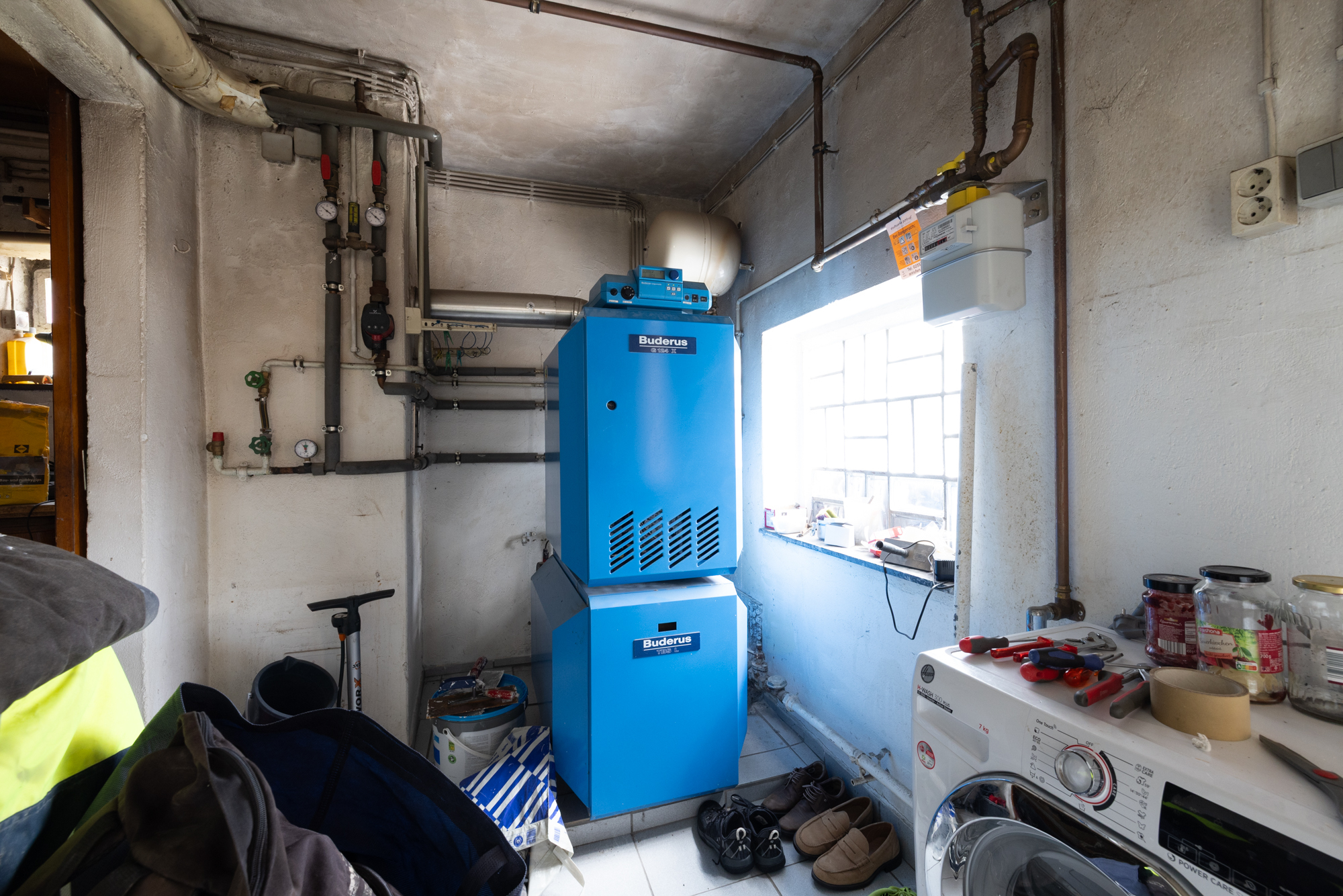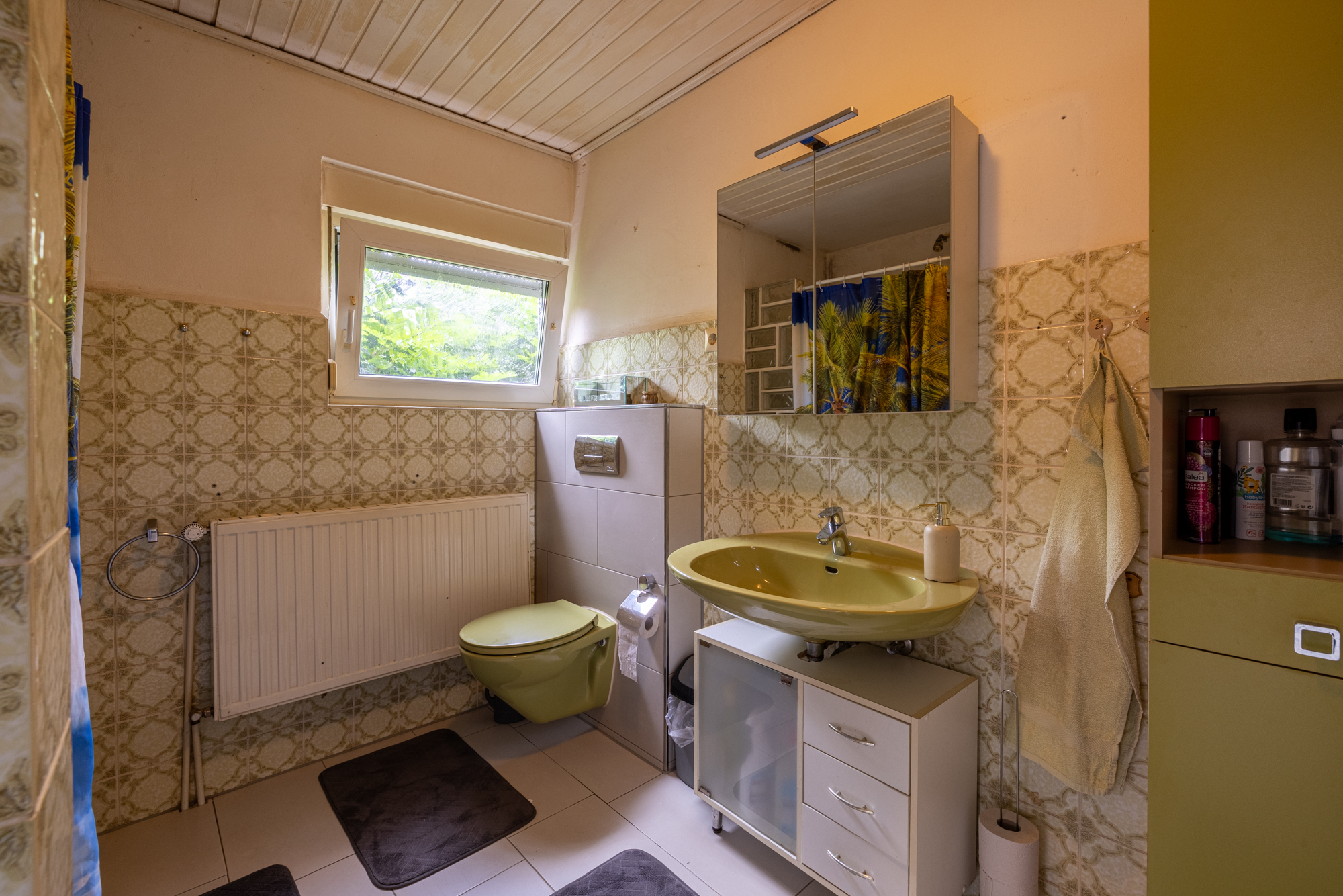 Ein kleiner Flur verbindet die Küche mit dem rückwärtigen Anbau des Hauses. Dort befinden sich ein Badezimmer: mit Tageslicht und großzügiger Dusche, Waschtisch und WC. Zusätzlich steht ein separates Gäste-WC zur Verfügung. Der Heizungsraum, ein Abstellraum sowie der Zugang zum Dachgeschoss und zur überdachten Terrasse sind ebenfalls im Anbau untergebracht.