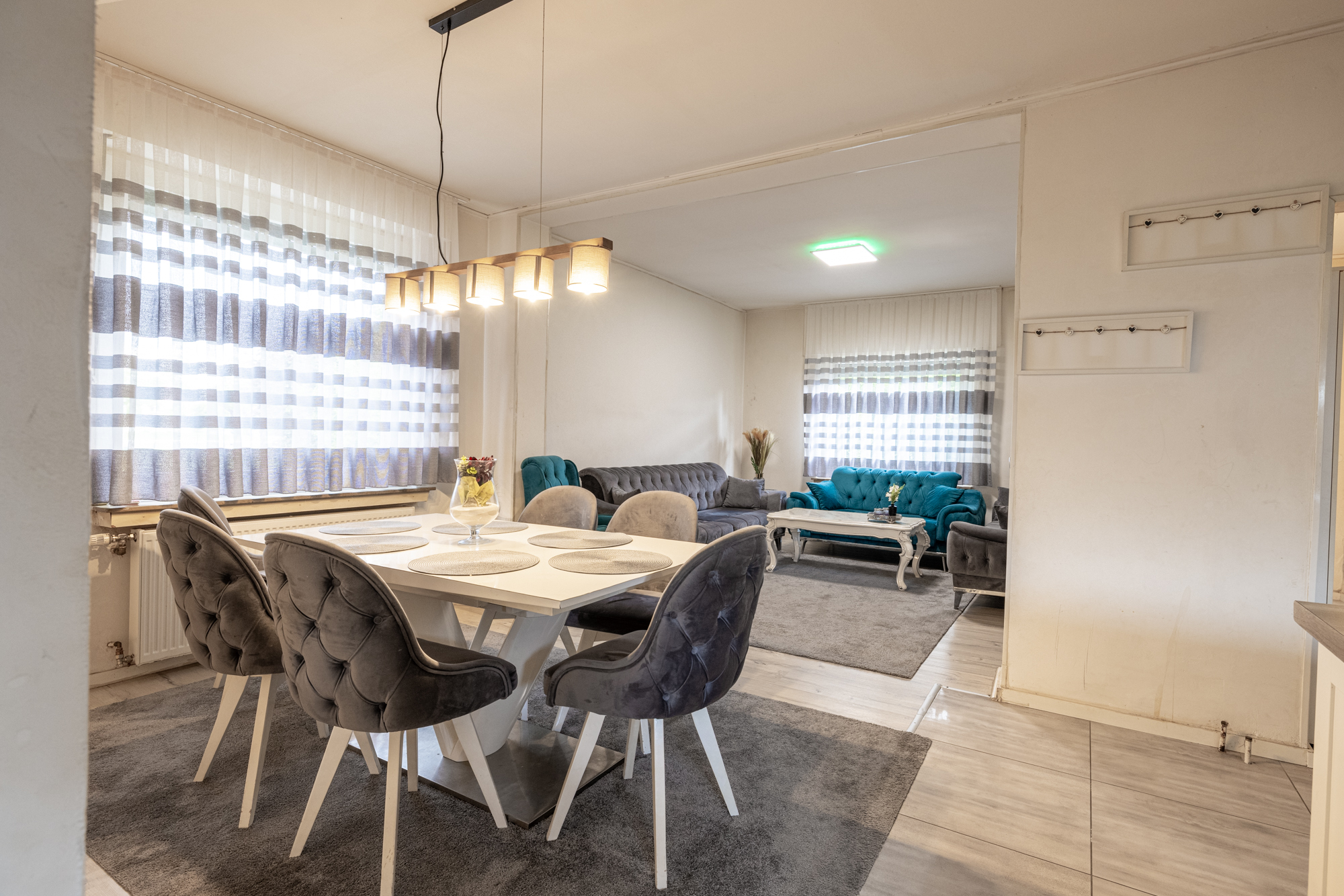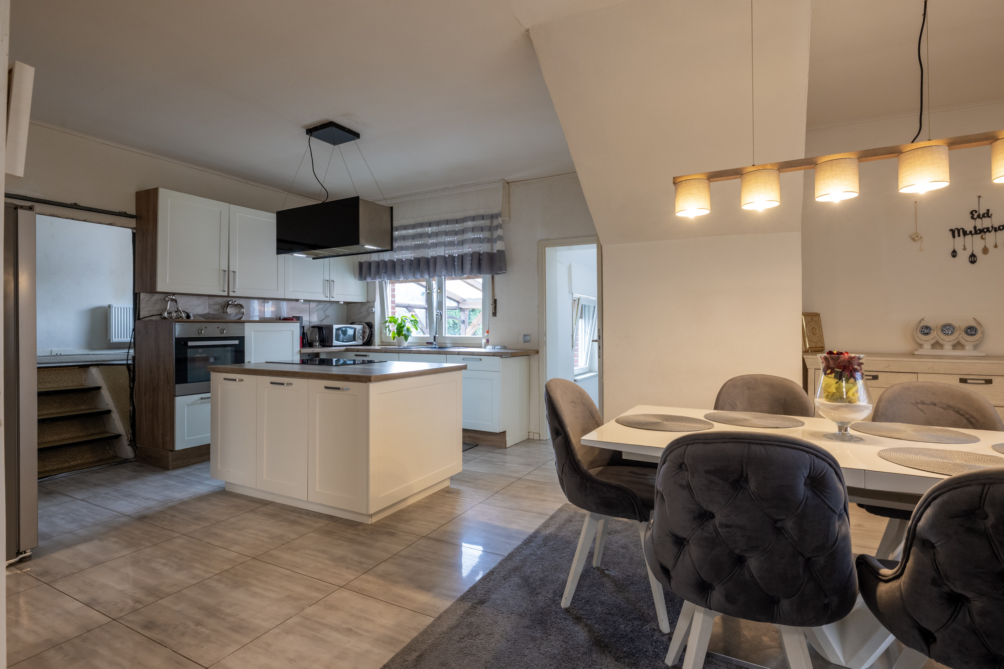 Von der Küche aus führt eine kleine Treppe in die sogenannte „Upkammer“ – einen weiteren Schlafraum mit separatem Zugang. Ebenfalls von der Küche erreichbar sind das Esszimmer sowie das angrenzende Wohnzimmer auf der rechten Hausseite. Küche/Esszimmer/ Wohnzimmer sind offen gestaltet und schaffen eine angenehme Wohnatmosphäre.