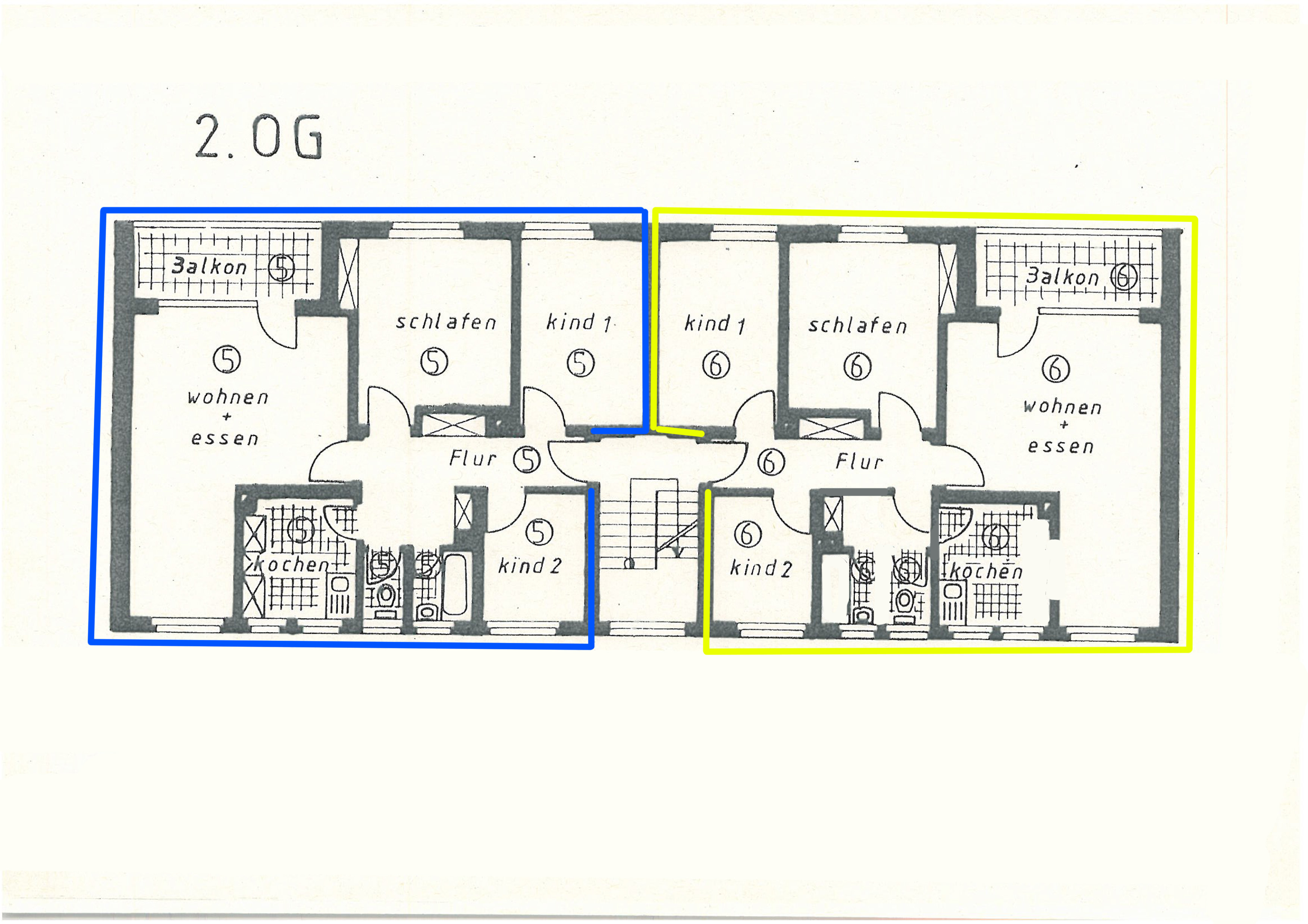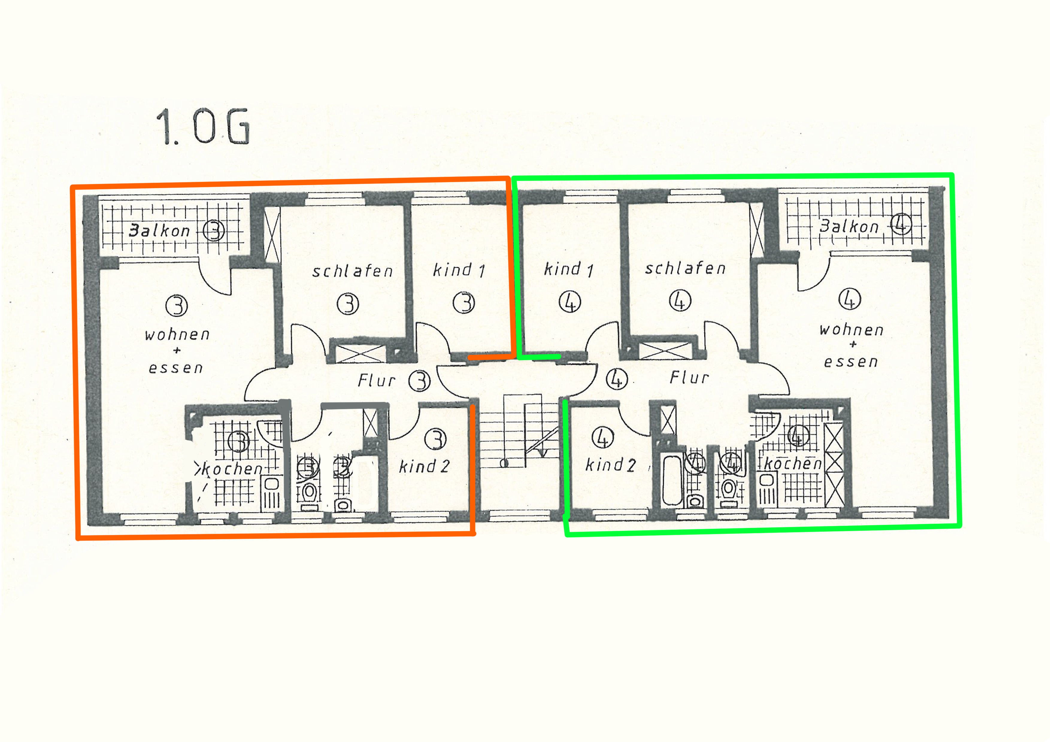 Jede Einheit ist gleich aufgeteilt (nur spiegelverkehrt) und bietet: drei Zimmer, Küche, Badezimmer, einen großzügigen Wohn- und Essbereich sowie einen Balkon. Alle vier Wohnungen wurden renoviert: Die Bodenbeläge wurden erneuert, die Wände frisch verputzt und gestrichen. In der linken Wohnung im 1. Obergeschoss sowie in der rechten Wohnung im 2. Obergeschoss wurde das Badezimmer vergrößert und die Küche zum Wohn-Essbereich hin geöffnet. Die Details entnehmen Sie bitte den Grundrissen im Anhang.