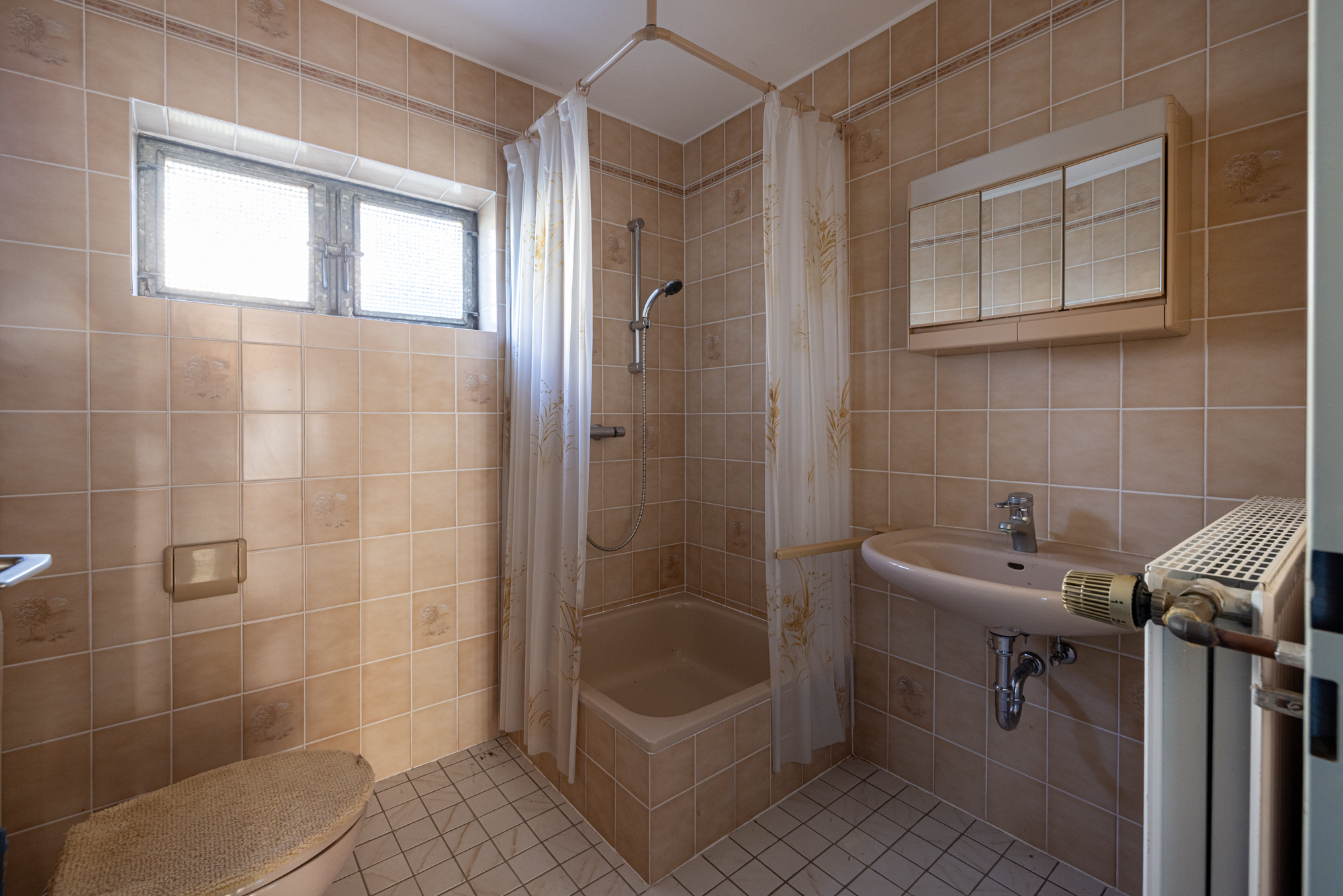 •Badezimmer mit Fenster und Badewanne